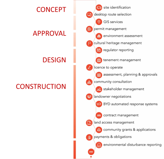 We have often referred to the lifecycle of a project or an asset, as shown in the following diagram. Along the way, there are several activities that take place that require engagement with stakeholders and landholders. These needs change as each project matures but the core data remains consistent.